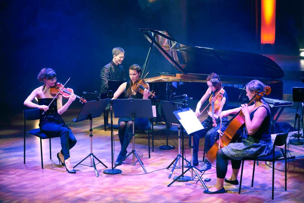 Piano and string quartet.
